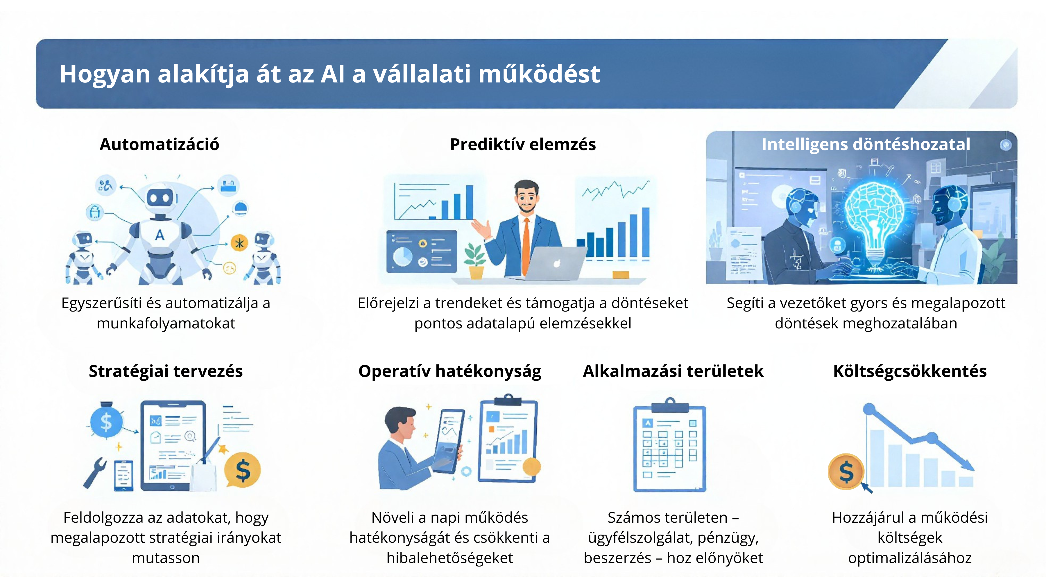 A mesterséges intelligencia forradalmasítja az üzleti működést az automatizáció, a prediktív elemzések és az intelligens döntéshozatal révén. Képes hatalmas adatmennyiséget feldolgozni, összefüggéseket felismerni, ezáltal támogatva a stratégiai tervezést és az operatív hatékonyság növelését. Az AI a vállalatok számos területén – az ügyfélkapcsolatoktól a pénzügyeken át a beszerzésig – hozzájárul a költségek csökkentéséhez és a versenyképesség javításához. A technológia folyamatos fejlődésével az AI egyre inkább beépül a mindennapi üzleti folyamatokba, új lehetőségeket teremtve a digitalizáció területén.