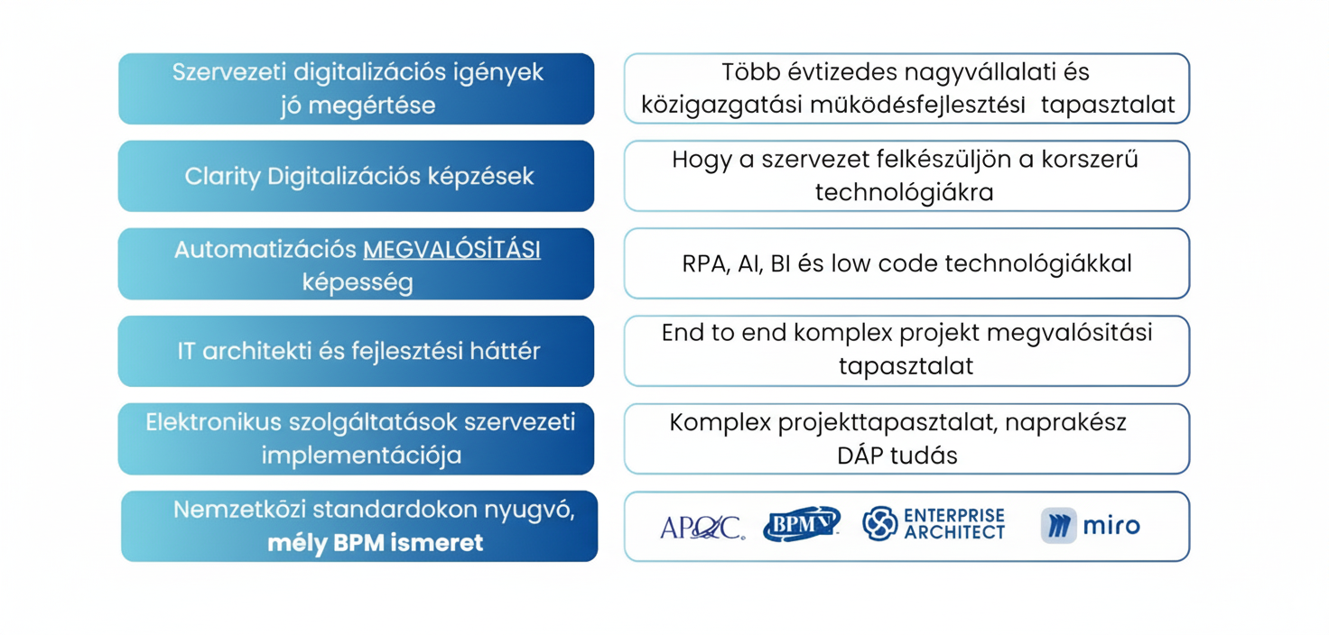 Itt a Clarity-ben felismertük ezt a nehézséget az ügyfeleinknél. Mivel nagy tapasztalatunk van a szervezeti digitalizációs igények jó megértésében, és jól ismerjük a technológiai lehetőséget (mi magunk is vezetünk be robotokat, intelligens megoldásokat), az igények és a technológia megfelelő párosításával tudunk a legtöbb értéket teremteni. Na meg azzal, ha közben tanítjuk is az ügyfeleket az új technológiákra.
